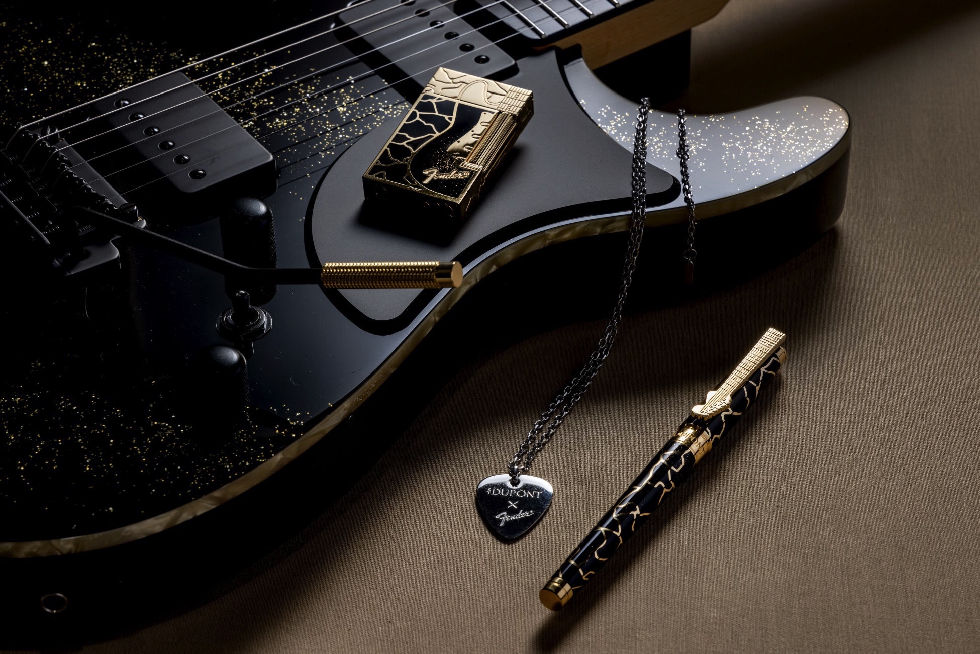 精緻なギヨシェ模様と金継ぎに着想を得たラッカー装飾、そして伝統的な手作業による金粉技法が融合した本コレクションは、音楽とクラフトの世界をつなぐ芸術作品です。S.T. デュポン × フェンダー ピックネックレスは、この融合の象徴とも言えるアイテム。ライターやペンのネックレスデザインと呼応するロックなアクセントが光ります。