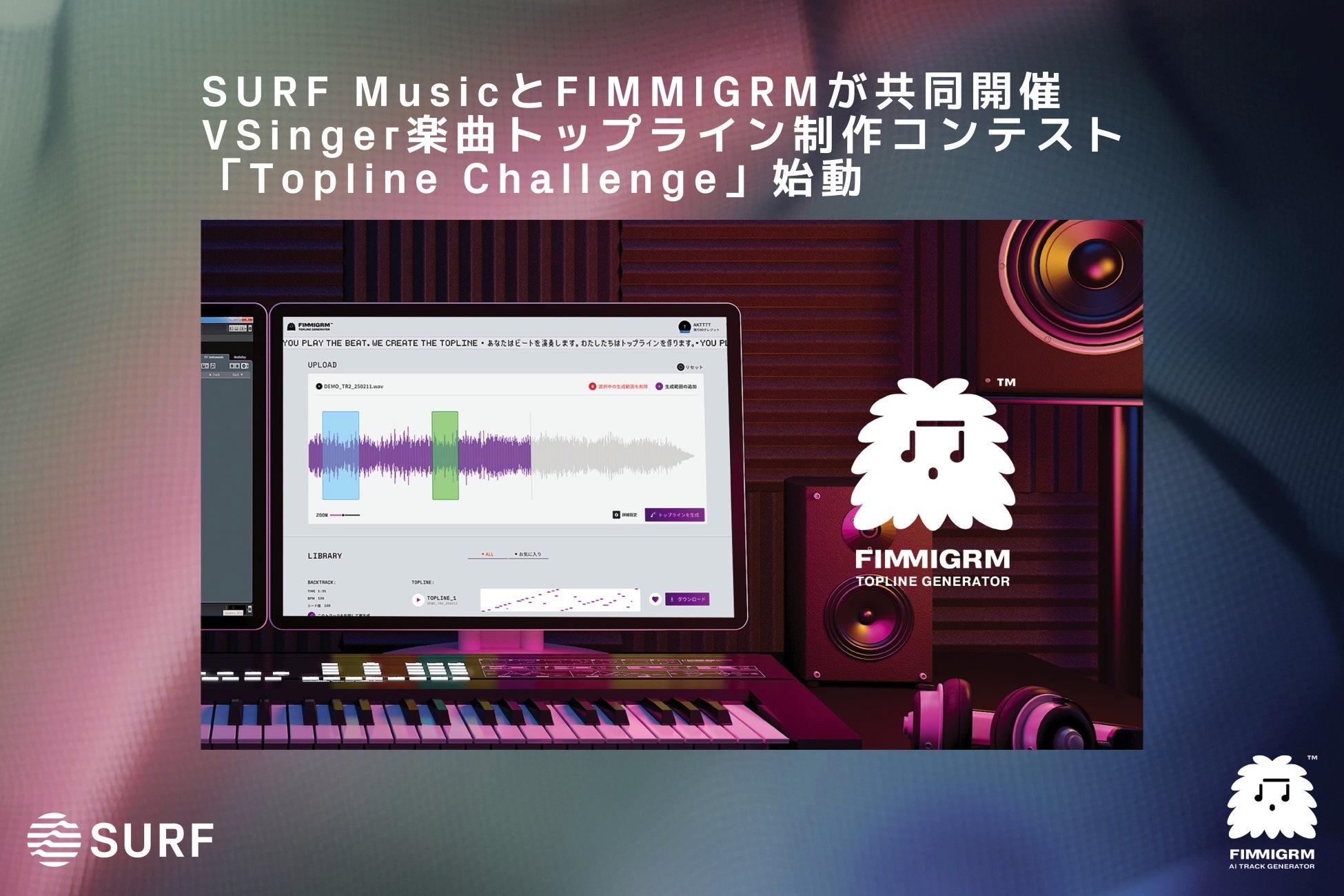 株式会社SURF Music(本社:東京都渋谷区)と、音楽×テクノロジー領域で事業を展開する株式会社TMIK(本社:東京都渋谷区、CEO:玉井健二)は、AIトップライン自動生成エンジン「FIMMIGRM(フィミグラム)」を活用したグローバルコンテスト 「SURF Music x FIMMIGRM Topline Challenge」 を、2025年12月5日(金)より開始いたしました。